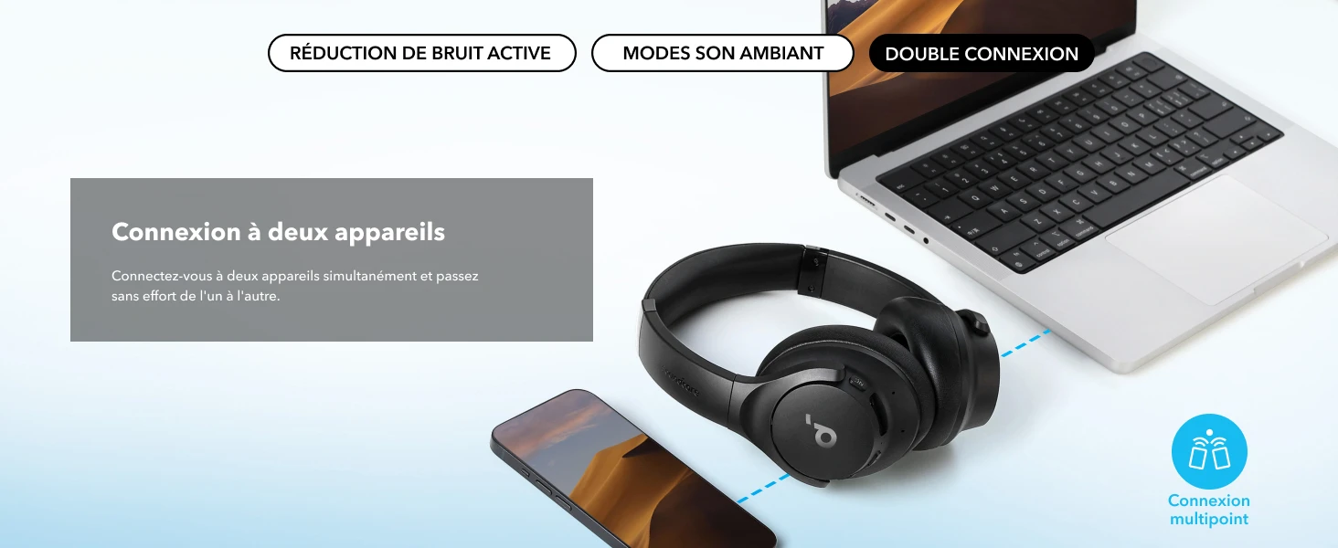 For extra convenience, connect up to two devices at the same time. The noise canceling headphones will intelligently switch to the device that is playing audio.
